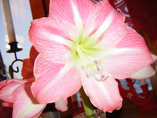 Nu ligger den på köpmandisken, tillsammans med smidesljusstaken jag fick i 18-årspresent (något modifierad då, den gravt fula överdådiga blåa sidesbandsdekorationen som andades för mycket början på 90-tal är borttagen, och de blåa glas kuporna är ersatta med vackra vita vanliga ljus) och amaryllisen i en av mammas fina vaser.